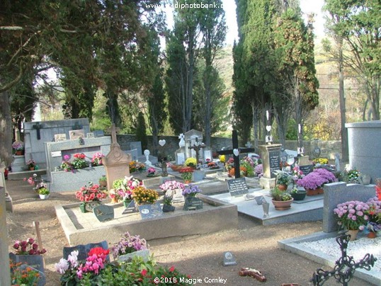 1st November is Toussaint or All Saints. French families buy chrysanthemums for the graves. Cascastel cemetery is typical of many all over the Languedoc. The 2nd November is the "Fêtes des Morts" but it is Toussaint that is the holiday. My local informant told me that on the 2nd November, when he was young, (he is 80) they all processed to the cemetery whereupon the priest went round swinging incense over the graves