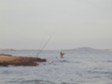 "One man and his dog" spending the afternoon fishing off the beach at Serignan Plage, near Béziers, with Cap d'Agde in the background
