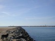 Hélène watching a a fishing boat returning up the River Orb towards the Marina of Valras Plage, the seaside town closest to Béziers