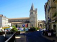 The colourful flags and neatly trimmed centre of a roundabout in the town centre with one of the classic buildings behind