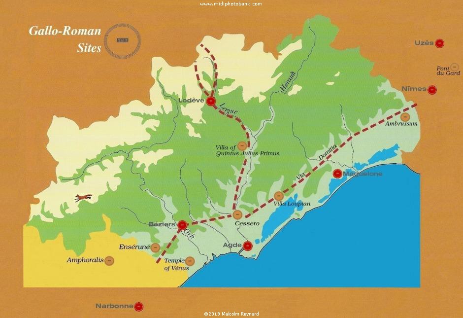 Map of the Region shewing Ambrussum at the North Eastern end of of the Roman "Via Domitia". It also shews the location of a number of other Roman sites and the Seven Towns of "Septimania".