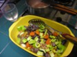 Heat up the “marinade” wine with a little cornflower to thicken it, transfer to the “Wok” to deglaze it – then pour over everything in the casserole. Might be necessary to add some more wine (if you have not drunk it all !).