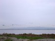 A flock of Flamingos fly over - across the lake is the "La Clape" range of hills, near Gruissan Plage