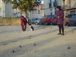 The 'Great French Game' of Boules played in any convenient square or gravelled area - unusually, on this occasion, by two ladies (and a dog !!!)