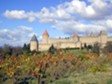The old City (Cité) of Carcassonne seen from the countryside, rather than the more common views from the town side, in the foreground the last of the autumn leaves still hanging on to the vines that surround the town.