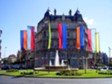 The colourful flags and neatly trimmed centre of a roundabout in the town centre with one of the classic buildings behind
