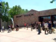 Dogs and hunters outside the new reception area of the enlarged Mont Tauch Cave Cooperative at Tuchan