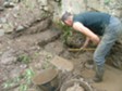 Patrice clearing the mud and rubble to disclose what is left of the basin's surrounding wall. This was built using marble brought down from Quintillan missing the stone plaque. Both this and parts of the surrounding wall of the basin under the fountains were swept away by the flood of 1999