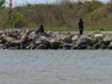 In the warm spring sunshine some are enjoying fishing in the mouth of the river Aude just before it joins the Mediterranean Sea