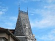 A very notable roof and carved stone supporting it next to a grotty (probably 60s) monster