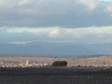Looking across some Languedoc vineyards, over the small town of Capestang, towards the mountains of the "Haute Languedoc Regional Park